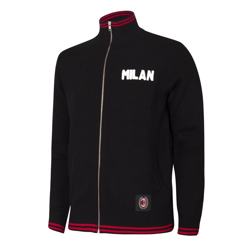 AC Milan jacket by COPA Football for adults. This AC Milan Embroidery retro jacket is based on the AC Milan football jackets from the 1960s. The AC Milan jacket is predominantly black with red accents. The red color is also featured on the stripes at the collar, the piping, and the bottom of the jacket. The left chest features embroidery with the name of the Italian football club, MILAN. The AC Milan retro jacket also has two slit pockets. A beautiful AC Milan zip-up jacket for the true Milan fan! The AC Milan retro jacket by COPA Football has a regular fit. Material: 55% acrylic - 45% cotton.