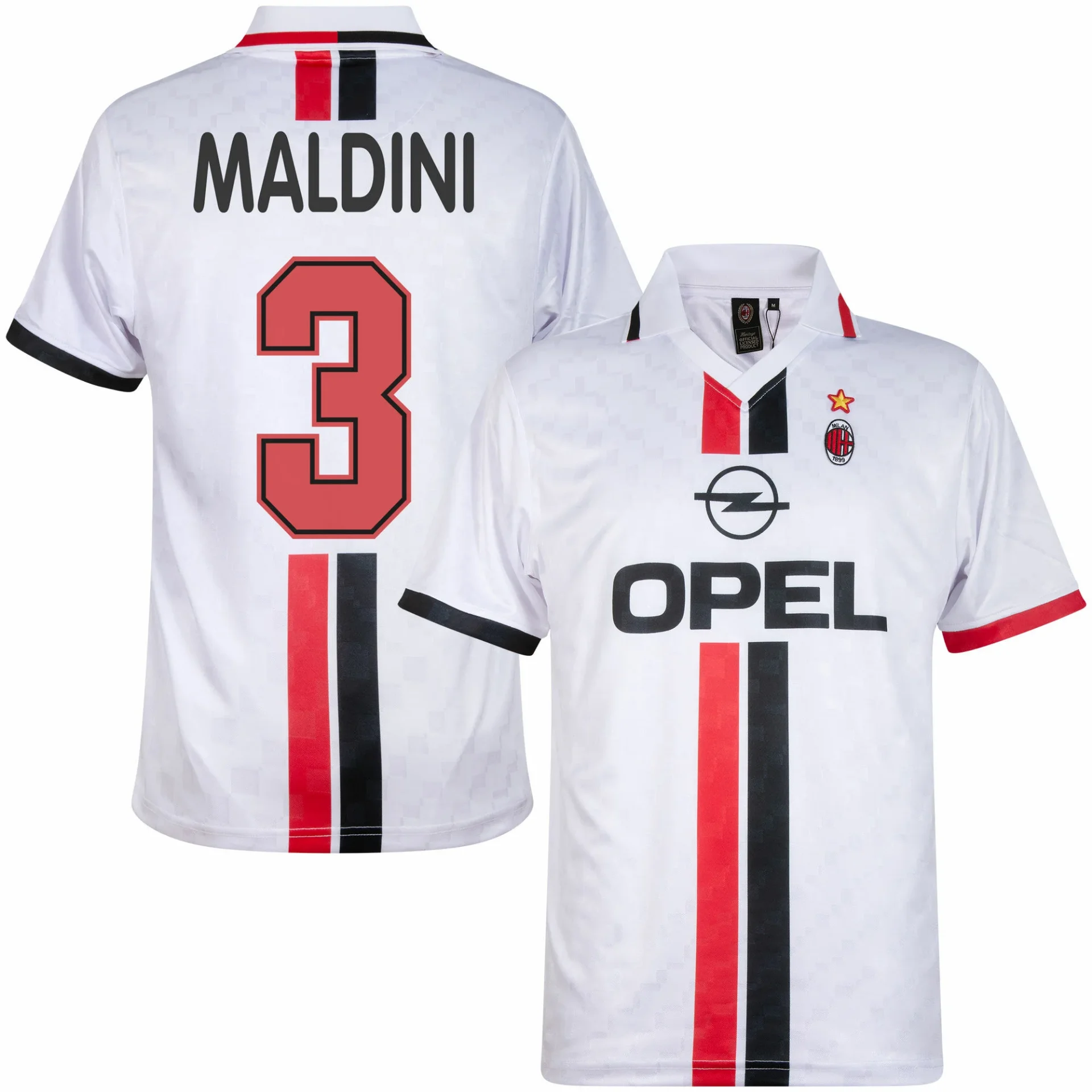 This is the official AC Milan retro football shirt 1995-1996 from COPA Football. The back features star player Maldini (3) printed on it. This Milan retro football shirt is based on Milan's away shirt from the 1995/96 season. The retro football shirt is predominantly white and is characterized by the red and black stripes down the center of the shirt. The name of the then-sponsor, OPEL, is printed in the center of the chest. The left chest features the AC Milan logo with a gold star above it. This AC Milan retro football shirt also features a white V-neck and polo collar. A fantastic AC Milan football shirt for the true Milan fan! The AC Milan retro football shirt from COPA Football has a regular fit. Material: 100% recycled polyester.