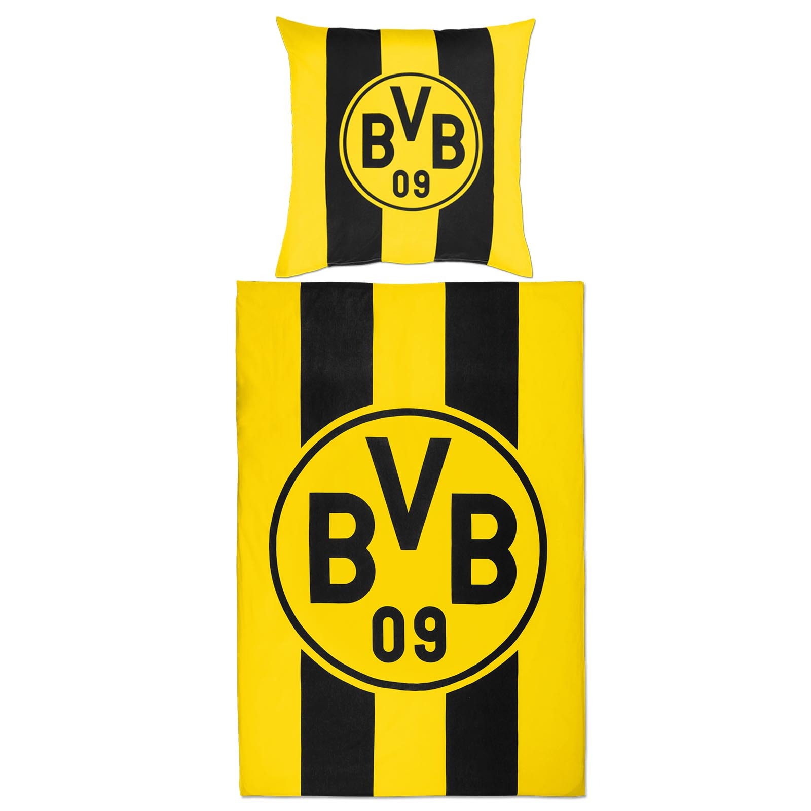 This is an official Borussia Dortmund duvet cover and pillowcase for a single bed. The duvet and pillow are designed entirely in the club colours of Borussia Dortmund and feature the Borussia Dortmund logo. The duvet cover is black with yellow stripes and includes the Borussia Dortmund crest. The pillowcase measures 80 x 80 cm, and the duvet cover measures 135 x 200 cm. This is a set suitable for a single bed. Perfect for any true Borussia Dortmund fan! The duvet cover set comes in a special bag from the German football club.