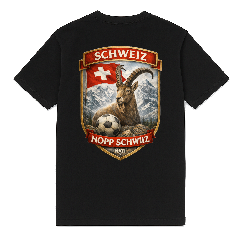 Stylish Switzerland heavy T-shirt for adults by FC ELEVEN. The heavy T-shirt is made from heavyweight organic cotton. The back of the T-shirt features a print of a shield with a 3D print of an ibex in the Swiss landscape. The design is fully styled in the national colors of the country, red and white. In addition, the logo includes the text Hopp Schwiiz, created especially to support the Swiss national team. The T-shirt also features the FC brand initials in black on the left chest. This is a silicone logo. The heavy T-shirt is fully black and has a round neckline. The T-shirt is made from heavyweight cotton and has a regular fit. Material: 100% organic cotton.