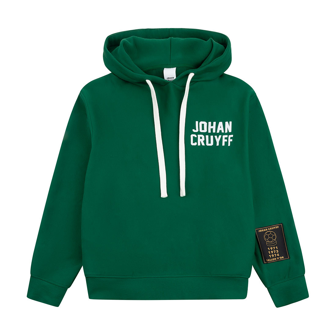 Stylish Johan Cruyff hoodie in green for adults. This premium hoodie is made from 100% heavy French terry cotton and features a relaxed fit for maximum comfort. A white Johan Cruyff logo is displayed on the chest. The Ballon d'Or patch on the left sleeve shows the years in which Johan Cruyff won this prestigious award. Finished with a ribbed collar and hem for a refined and luxurious look. A perfect blend of comfort, style and football heritage.