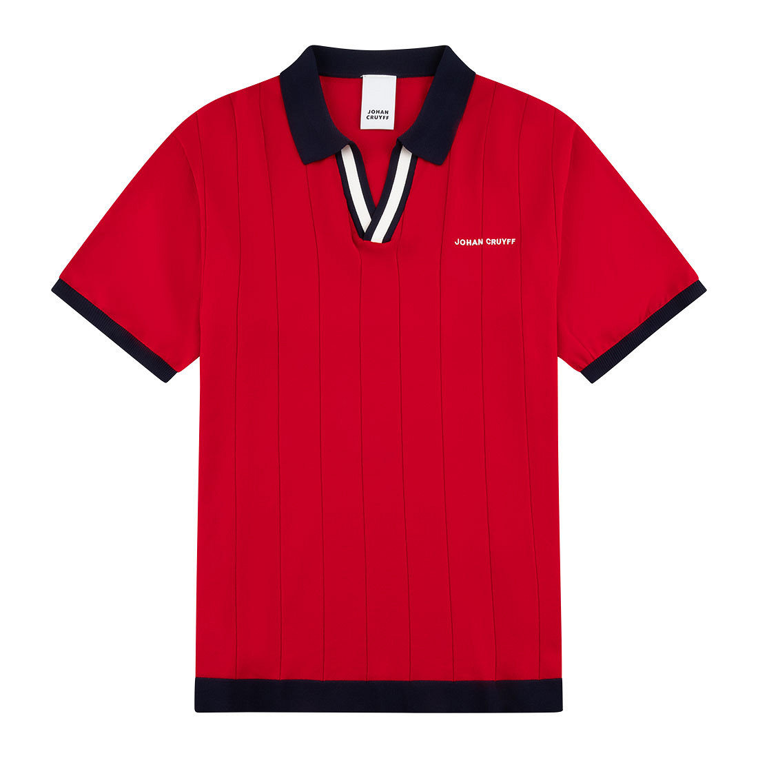 This Johan Cruyff retro sport polo shirt in red is a stylish choice for fans of classic sportswear. The luxury polo features a comfortable regular fit, a ribbed black collar, and a black and white V-neck design. The embroidered Johan Cruyff logo on the left chest highlights its premium quality.
